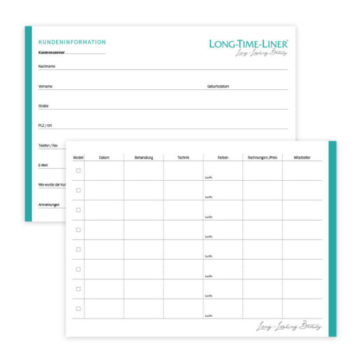 Beidseitig bedruckt für Ihre interne Kartei, damit Sie die wichtigsten Kundendaten zu Ihrer LONG-TIME-LINER Behandlung immer zur Hand haben.